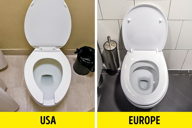 For more than 40 years, I lived in the US. Generally, all the toilets are the same. Recently, we have adapted to the elongated toilet bowl versus the round bowl. This may be because our population is getting heavier and wider, and, well, for males this is just a more user-friendly design. Our bowl shape holds a significant amount of water and has shallow depth. In hindsight, I can see how Europeans may think the toilet is clogged with all the water in the bowl, but I think the design is to help keep the bowl cleaner. And, it allows for inspection of the deposit.